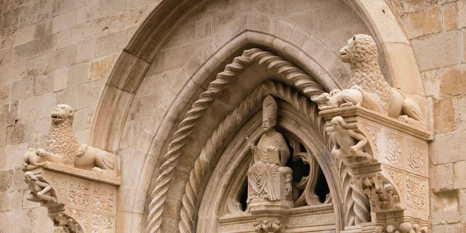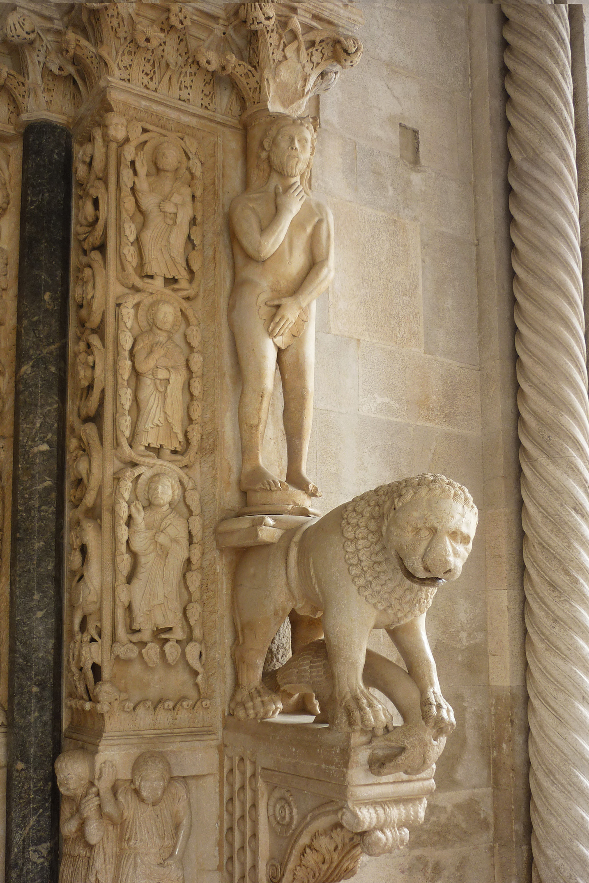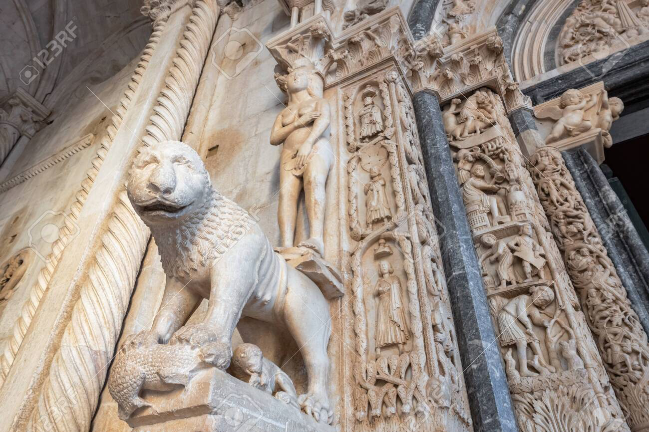 VIDÍM PRVÝ HRIECH - ústredný takto nazvaný motív románskeho portálu pri vstupe do katedrály v Trogire, mesta pri Jadranskom mori. Adam a Eva v nadživotnej veľkosti si zakrývajú rukami intímne miesta. Ona stojí na levici, ktorá chráni svoje čerstvo vyliahnuté mláďatá. Adama podopiera lev držiaci v pazúroch korisť - mohutného vtáka.